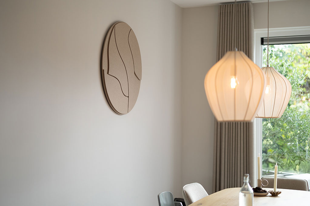 Ontdek Virelle, een verfijnde muurdecoratie die textuur en elegantie combineert. Het kunstwerk is vervaardigd van hoogwaardig PET-vilt en bestaat uit ronde elementen die in twee lagen zijn opgebouwd, waardoor een subtiele diepte en een speels effect ontstaat.